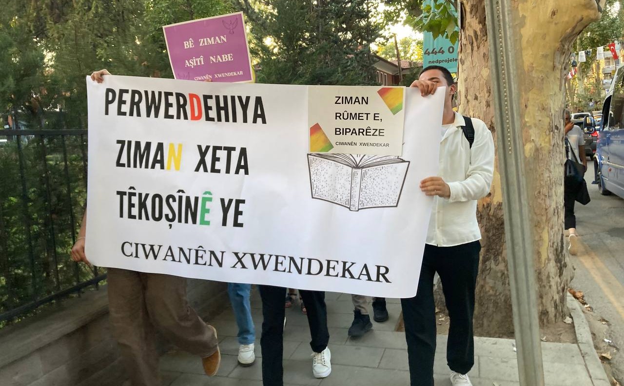 Çok sayıda öğrencinin de katıldığı eylemde, “Zimanê me rumeta me ye” ve “Bê ziman jiyan nabe” sloganları ile üzerinde “Zimanê Kurdî xeta me ya sor e, destên xwe jê vekişînin” yazılı pankart taşındı.