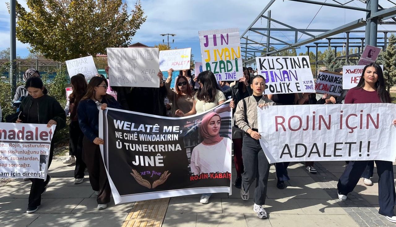 ”kuştına jinan polîtîk e”, “İntihar değil, bu bir cinayet” ve “Susma, sustukça sıra sana gelecek” sloganlarıyla yürüyen öğrencilerin eylemine, araçlarıyla konvoy oluşturan taksiciler de katıldı. Dün öğrencilerin yaptığı çağrı üzerine yaklaşık 200 taksici, “Rojin için tek ses olalım” diyerek kampüse gelerek destek verdi.