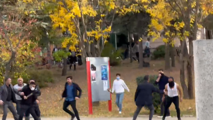 Öte yandan saldırıların videosunu çekmek isteyen öğrencilere ise güvenlik müdahale etti. Elinde kesici alet olan bir kişinin de güvenliğin yanında kesici aleti saklaması ve güvenliken sorumlu kişinin bu duruma müdahale etmemesi dikkat çekti. Bu durum da kameralara yansıdı.