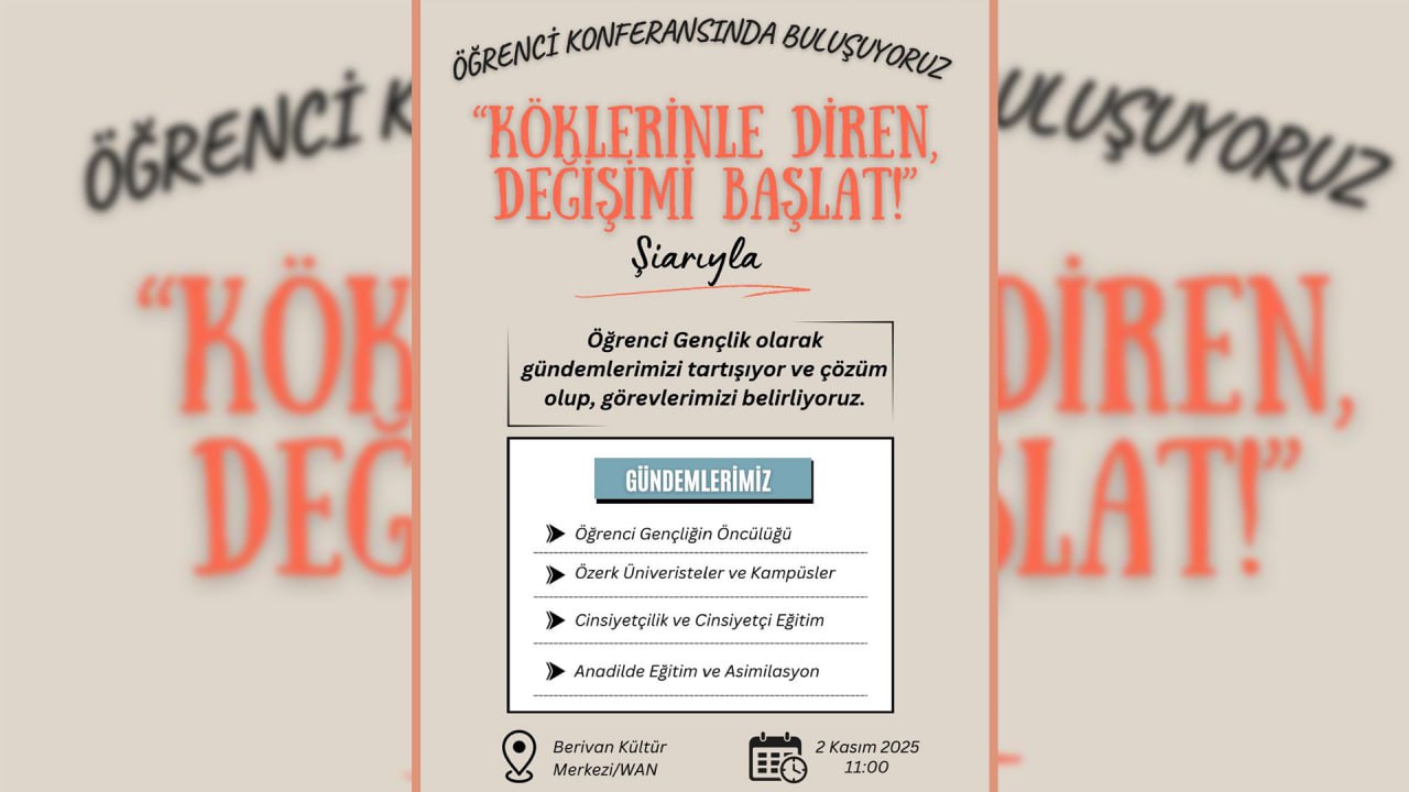 HABER MERKEZİ- Wan’da Demokratik Öğrenci Birliği, 2 Kasım’da konferans düzenleyecek. Konferansta öğrenci gençliğin karşı karşıya kaldığı sorunlar, bu sorunlara karşı geliştirilecek çözüm yolları ve mücadele perspektifleri tartışılacak.