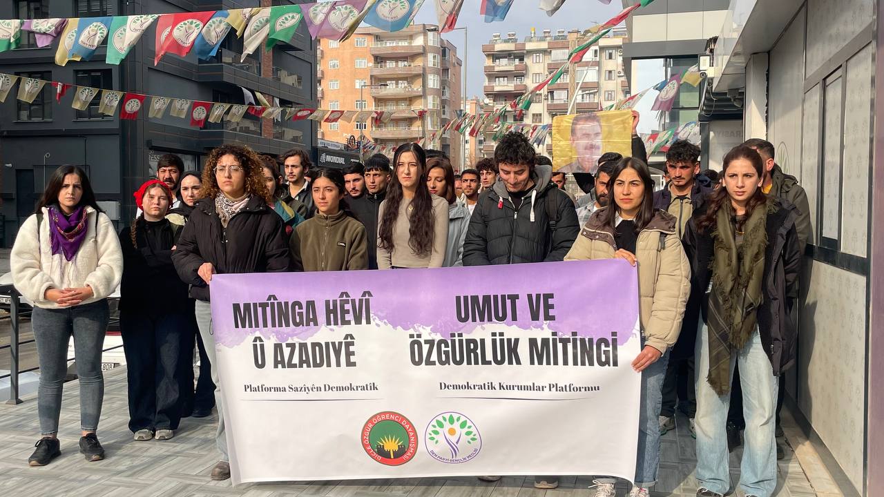 Amed’de DEM Parti İl binası önünde bir araya gelen Dicle Özgür Öğrenci Dayanışması, DEM Parti Gençlik Meclisi ve DBP Gençlik Meclisi üyeleri, 4 Ocak’ta Amed İstasyon Meydanı’nda Abdullah Öcalan’ın fiziki özgürlüğü talebiyle gerçekleştirilecek “Umut ve Özgürlük” mitinginin deklarasyonunu açıkladı. Açıklamanın Kürtçe kısmını DEM Parti Gençlik Meclisi üyesi Berivan Kocaoğlu, Türkçe kısmını ise Dicle Özgür Öğrenci Dayanışması üyesi Diyar Soyal okudu.