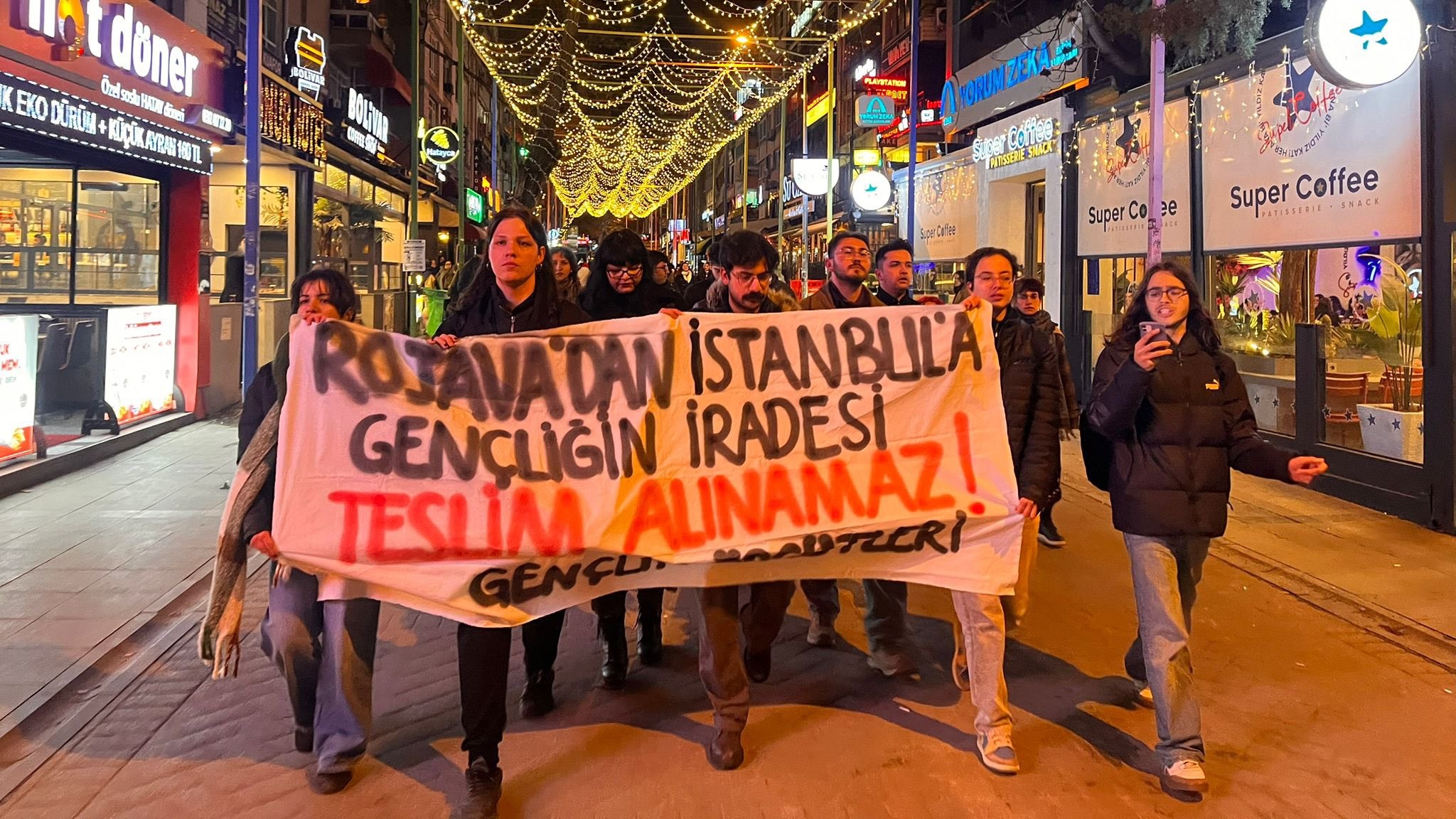 Çankaya’nın Konur-2 Sokağı’nda bir araya gelen gençlik örgütleri, sloganlar eşliğinde Yüksel Caddesi’ndeki İnsan Hakları Anıtı’na meşaleli yürüyüş gerçekleştirdi. Yürüyüşte “Rojava’dan İstanbul’a gençliğin iradesi teslim alınamaz” pankartı açılırken, “Bijî berxwedana Rojava”, “İşgalciler yenilecek direnen halklar kazanacak” ve “Bijî berxwedana ciwanan” sloganları atıldı.