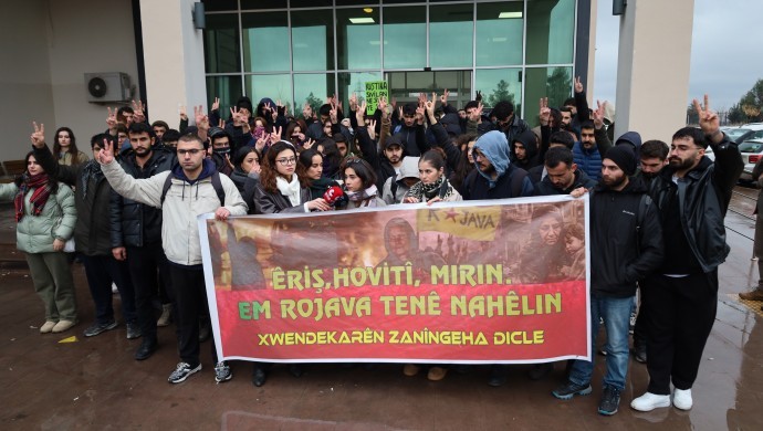 Dicle Üniversitesi öğrencileri, Halep’in Şêxmeqsûd ve Eşrefiyê mahallelerine yönelik saldırılara tepki göstermek amacıyla Hukuk Fakültesi önünde bir araya gelerek yürüyüş düzenledi. Fen Fakültesi’ne doğru yapılmak istenen yürüyüş, polis ve özel güvenlik görevlileri tarafından engellenmeye çalışıldı.