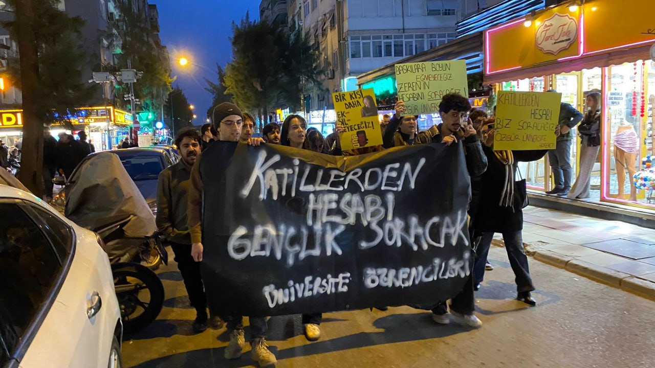 İzmir’de Ege Üniversitesi öğrencileri, iki yıl önce Aydın’daki KYK yurdunda ihmaller sonucu yaşamını yitiren Zeren Ertaş için adalet talebiyle yürüyüş gerçekleştirdi. Yürüyüşte “Katillerden hesabı gençlik soracak” pankartı taşınırken, öğrenciler “Bir kişi daha eksilmeyeceğiz” ve “Baskılara boyun eğmeyeceğiz Zeren’in hesabını soracağız” yazılı dövizler açtı.