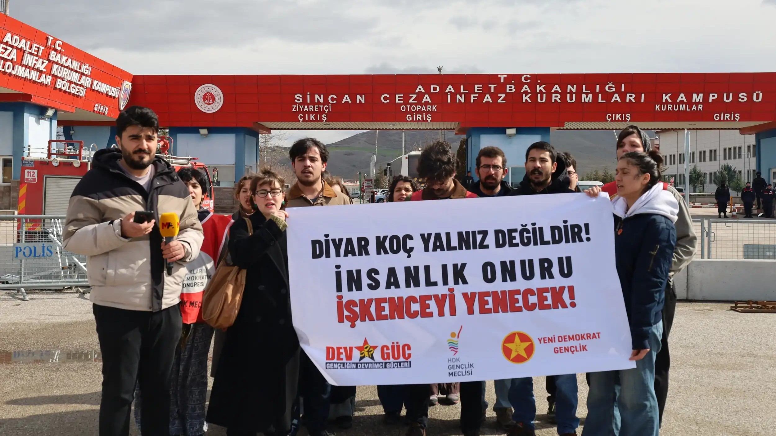 Halkların Demokratik Kongresi (HDK) Gençlik Meclisi, Gençliğin Devrimci Güçleri (Dev-Güç) ve Yeni Demokrat Gençlik üyeleri, Türkiye’nin desteklediği çetelerin Rojava’ya yönelik saldırılarına karşı Mêrdîn’in Nisêbîn (Nusaybin) ilçesinde düzenlenen protestoda “bayrak indirdi” iddiasıyla işkence yapılan ardından tedavisi tamamlanmadan tutuklanan Diyar Koç’un bulunduğu Sincan Cezaevleri Kampüsü önünde açıklama yaptı.
